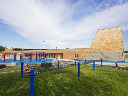 Holz, Lowtech, Kreislauf: Das Bildungszentrum in Bürstadt setzt auf recycelten Beton, Brettsperrholz und passive Strategien – klimaneutral über den gesamten Lebenszyklus.