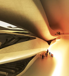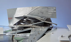aber auch mit dem Anspruch, städtebauliches Wahrzeichen zu sein, erscheint die Philharmonie in Stettin der jungen spanischen Architekten von EBV aus Barcelona. Den ersten Preis haben sie sich mit ihrer maßstäblich geschickt an die direkte Umgebung angepassten Lösung verdient. Die kristalline Struktur nimmt nicht nur Merkmale des direkt anschließenden neugotischen Nachbargebäudes auf, sondern ist auch im Inneren schlüssig gefüllt. Dass hier der Anspruch eines Leuchtturmprojekts allzu wörtlich genommen wird und tatsächlich an eine Illumination der gesamten Kubatur von innen heraus gedacht ist, darf kritisch hinterfragt werden. Bei der Ausführung der hierfür vorgesehenen Doppelfassade müsste man wohl völlig neue Wege gehen. Die gewählte Form der Musiksäle sollte akustisch problemlos sein.