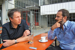 Baustelle Bauhaus: Philipp Oswalt und Harald Kegler vor dem Dessauer Gebäude, dessen Außenraum zum 90. Geburtstag der Institution umgestaltet wurde. Das grafische Motiv oben hat Bauhaus-Vorbilder.