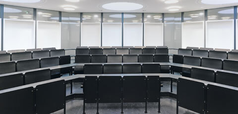 Und das geringe Budget hat dazu beigetragen, dass in den Vorlesungssälen die abgehängte Decke mit ihren kreisrunden Elementen im höchst hippen Siebzigerjahre-Konservendosenduktus erhalten blieb. Nur dem alten Farbkonzept wollte man nicht mehr folgen. Schließlich erschöpft sich die Faszination recht schnell, die von Schwarz, Olivgrün und Orange im Zusammenklang mit Kiefernholz bei der täglichen Begegnung ausgeht. An ihre Stelle ist eine zurückhaltende Farbauswahl getreten, die sich an der des Neubaus orientiert.