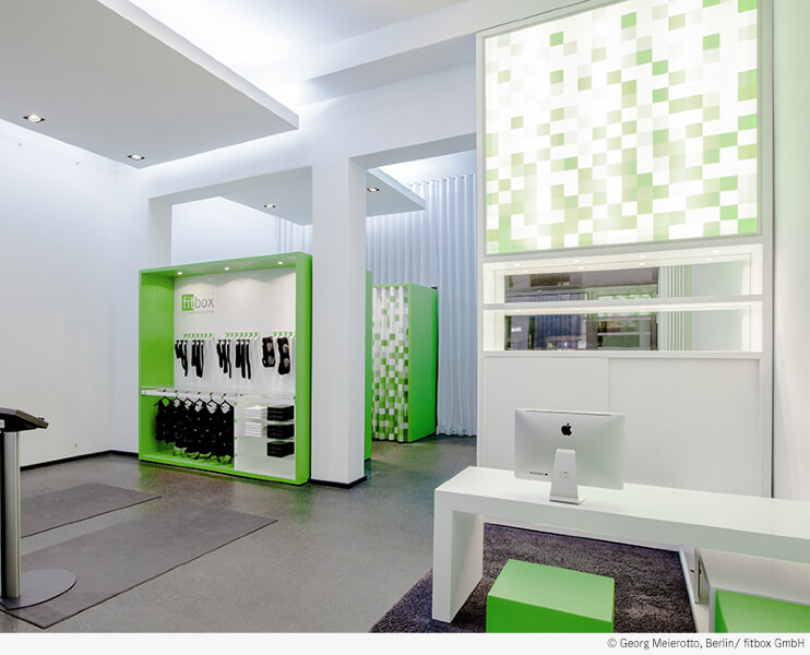 Die „Fitbox“ ist ein Serien- und Markenprodukt, innenarchitektonisch entworfen für einen gleichnamigen Betreiber von Fitnesszentren. Sie zeichnet sich durch kurze Wege, bewegliche Schiebewände und Möbel für unterschiedliche Raumauslastungen und eine gepixelte Leuchtwand aus, die den Trainierenden die Digitaltechnik der gerade genutzten Geräte vorführt. Die Funktionsflächen sind kompakt angeordnet, so dass mehr Freizeitsportler auf kleinem Raum aktiv sein können.schaeffer architecture and technology, München