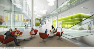 Quer über allem schwebt der Bettentrakt – ein Konzept, das KSP Jürgen Engel zuerst in seiner Chirurgie-Klinik in Ulm realisiert hat, die 2013 einen Preis als „Herausragender Gesundheitsbau“ erhielt. In Shanghai finden sich dort oben 100 Einzelzimmer. Dort werden die Kinder aber selten allein sein. „Da kommen oft alle vier Großeltern und beide Eltern mit.“ Für die Angehörigen gibt es einen Tisch mit Stühlen und eine Auszieh-Couch, die nachts in ein Bett für Angehörige verwandelt wird. „Das ist mehr Wohnzimmer als Patientenraum“, meint Reinsch.