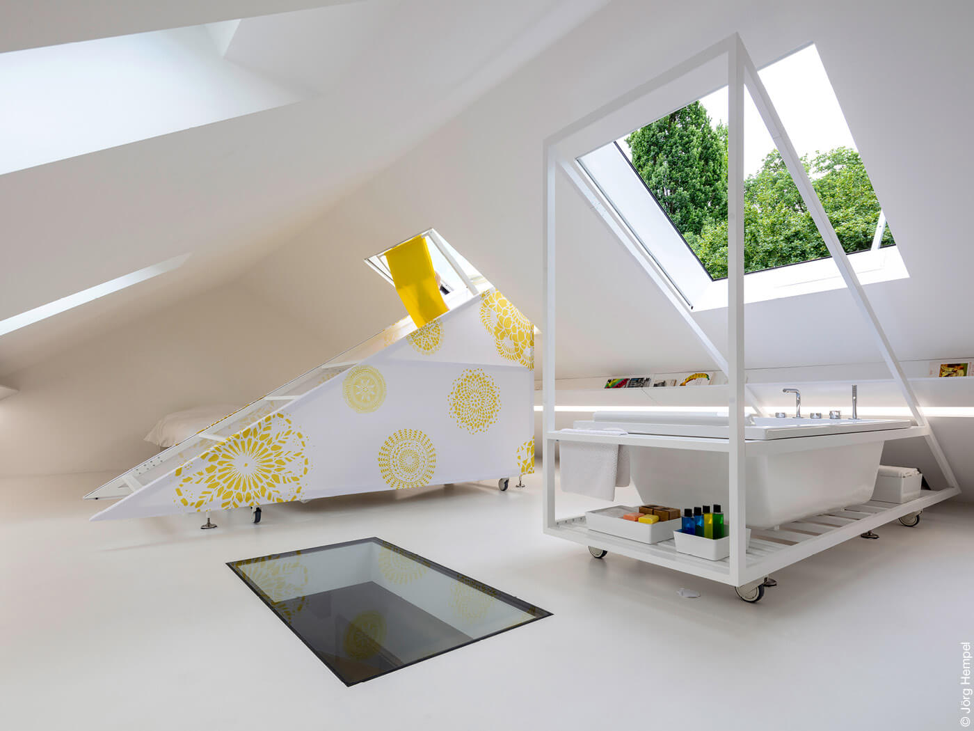 Die eine Vorrichtung integriert eine Badewanne, die andere eine Kombination aus Sonnenschirm und Liegestuhl, die in das geöffnete Dachfenster hineingeschoben werden kann und für eine Person als Balkon beziehungsweise Leseplatz dient. Man habe, so Kalhöfer, bei dieser Vorrichtung an den Filmklassiker „Die Ferien des Monsieur Hulot“ gedacht, in dem die Dachkammer mit Blick aus dem Fenster auf Strand und Meer sich als vergnügliche Galerie erweist. In Köln entstanden aus einem bis dahin kaum genutzten Raum durch die Neuinterpretation des Fensters als Schnittstelle von innen und außen so zwei neue Funktionen – Bad mit Himmelsblick und Terrasse en miniature.