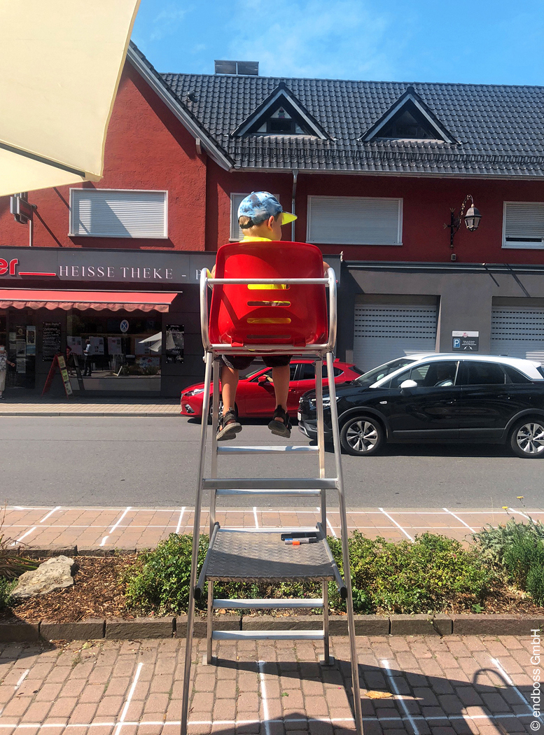 Kind sitzt am Straßenrand auf einem Hochsitz als Teil einer Bürgerbeteiligung