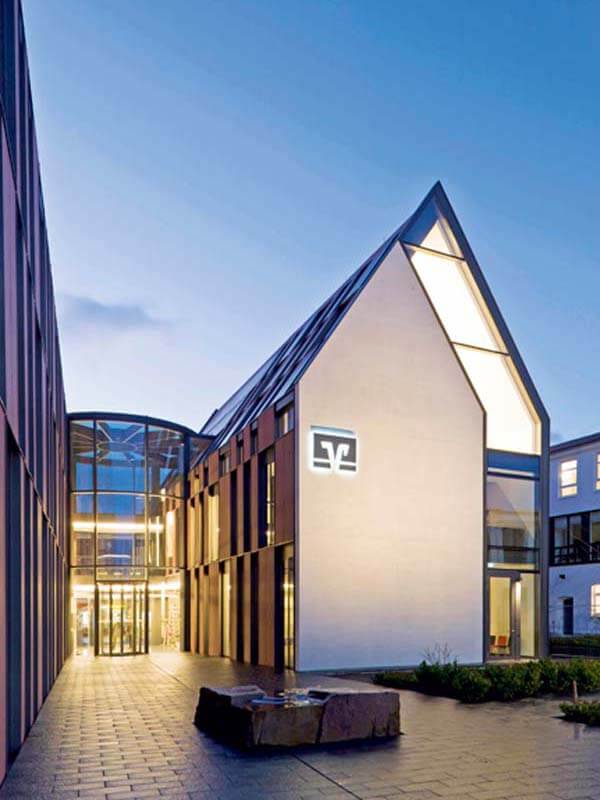 Zumindest formal knüpft der Neubau der Volksbank im niedersächsischen Gifhorn an die lokalen baulichen Traditionen an: giebelständig, schlichte Fassade, sehr zurückhaltend. Das war’s aber auch schon. Denn das Gebäudeensemble, errichtet nach dem siegreichen Wettbewerbsentwurf von Architekt Stephan Braunfels, lässt sich bestenfalls als radikal reduzierte Interpretation der ortsüblichen „Ackerbürgerhäuser“ beschreiben. Die erratische Straßenfront bildet einen spannungsreichen Kontrast zum zurückgesetzten Verbindungstrakt zwischen den beiden Gebäuderiegeln, der als öffentlicher, lebendiger Publikumsbereich genutzt wird.