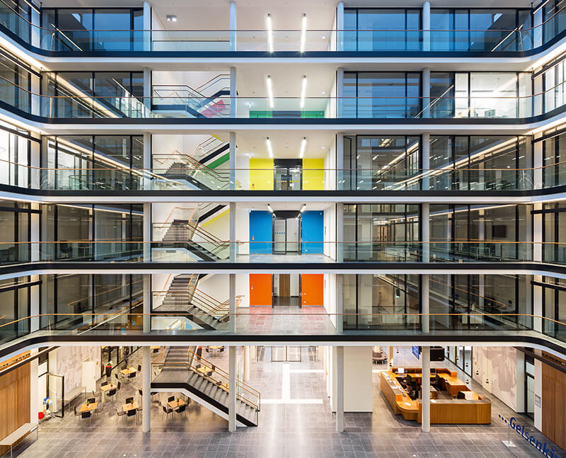 Ende August konnten Baubeteiligte und Bürger endlich die Neueröffnung des Hans-Sachs-Hauses feiern. Nach und nach ziehen jetzt die Mitarbeiter der Stadtverwaltung vom neun Kilometer entfernten Rathaus im Stadtteil Buer wieder ins Zentrum. Wie ein Magnet soll der Bau nun auch auf die Bürger wirken. Gar nicht so einfach, wie Architekt Hoffmann erklärt: „Die Fassade wurde sorgfältig restauriert und ergänzt. Aber sie ist in den historischen Bereichen nicht transparent und zieht die Besucher nicht automatisch in das Gebäudeinnere. Es müssen schon die Angebote des Hauses dafür sorgen, dass man es betritt und seine inneren Werte entdeckt.“ Das funktioniert gleich im Erdgeschoss. Hier sind neben einem gut frequentierten Restaurant, dessen Tische teilweise am Rande des Atriums stehen und für Belebung des riesigen Raums sorgen, auch die Touristeninformation und das Bürgercenter eingezogen. Gerade in der neuen zentralen städtischen Anlaufstelle für die Gelsenkirchener zeigt sich sehr gut, wie gmp es geschafft hat, trotz dicker Fassadenwände helle, benutzer- und besucherfreundliche Räume zu schaffen.
