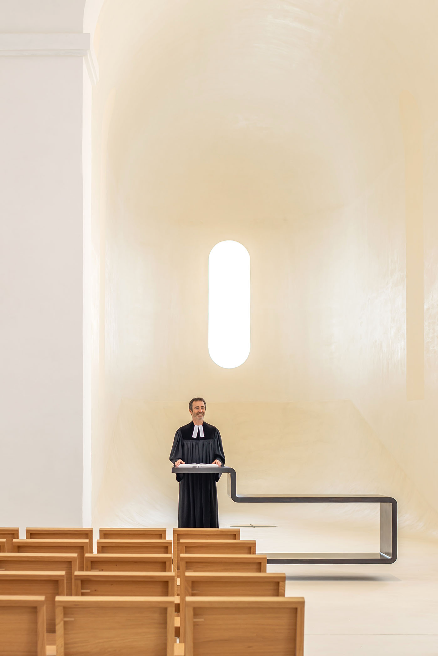 Ähnlich funktioniert die Wahrnehmung in der Christuskirche: Alle Kanten, an denen man sich orientieren könnte, verschwimmen, da die Wände in fließenden Linien mit Boden und Decke verschmelzen. Der Effekt vor Ort ist erstaunlich: Erst wenn jemand in den Chor hineinläuft, erkennt das Auge nach und nach die wahren Proportionen. Es wirkt, als würde der Raum von einer unsichtbaren Hand in die Tiefe gezogen. Dazu passte das Planerteam den weißen Lehmputz für Wände und Decke in Farbigkeit und Textur an die Estrichbeschichtung des Bodens an. Dieser geht als Kurve in die Wand über und löst so die Raumkanten auf.