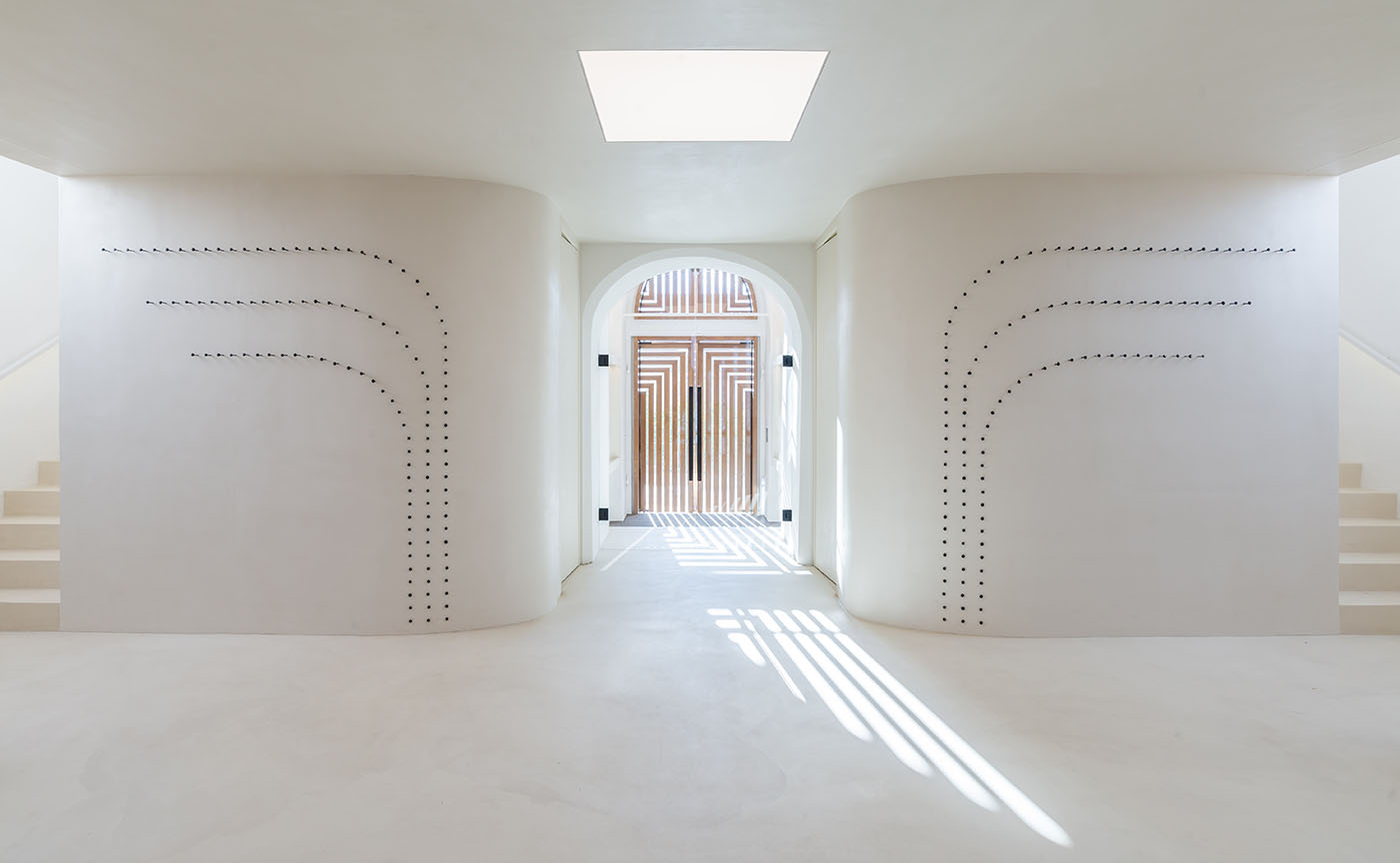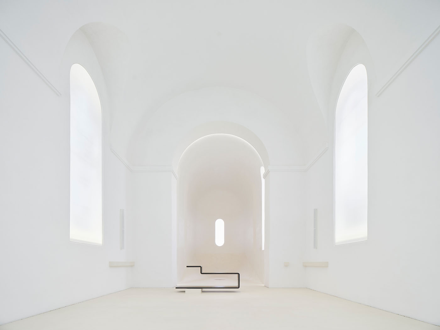 Weiche Kanten an den Wänden und Gewölben erzeugen zusammen mit den homogenen weißen Oberflächen einen abstrakten Rahmen, in dem sich die verschiedenen Lichtstimmungen optimal entfalten können. Dazu trägt auch die reduzierte Möblierung bei: Altar und Ambo sind als filigrane Stahlskulptur ausgebildet, durch die der Raum ungehindert hindurchfließen kann.