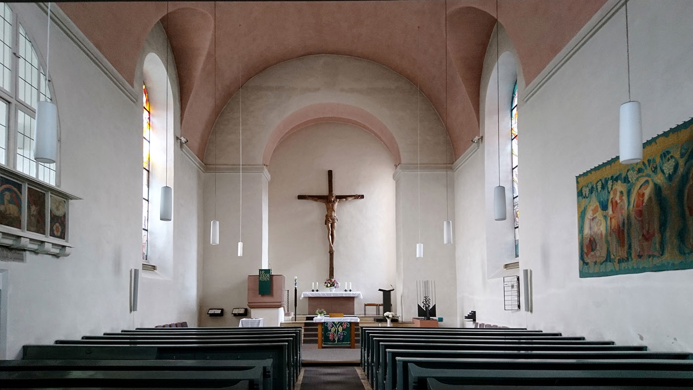 Im Chor der Christuskirche verschwimmen die Raumkanten, da Boden, Decke und Wände nahtlos ineinander übergehen. Erst wenn jemand in den Chor hineinläuft, erkennt das Auge die wahren Proportionen.