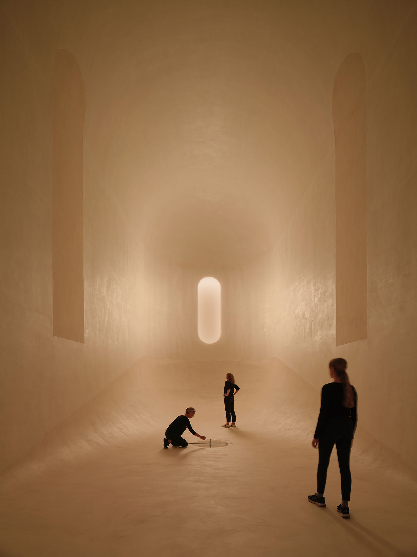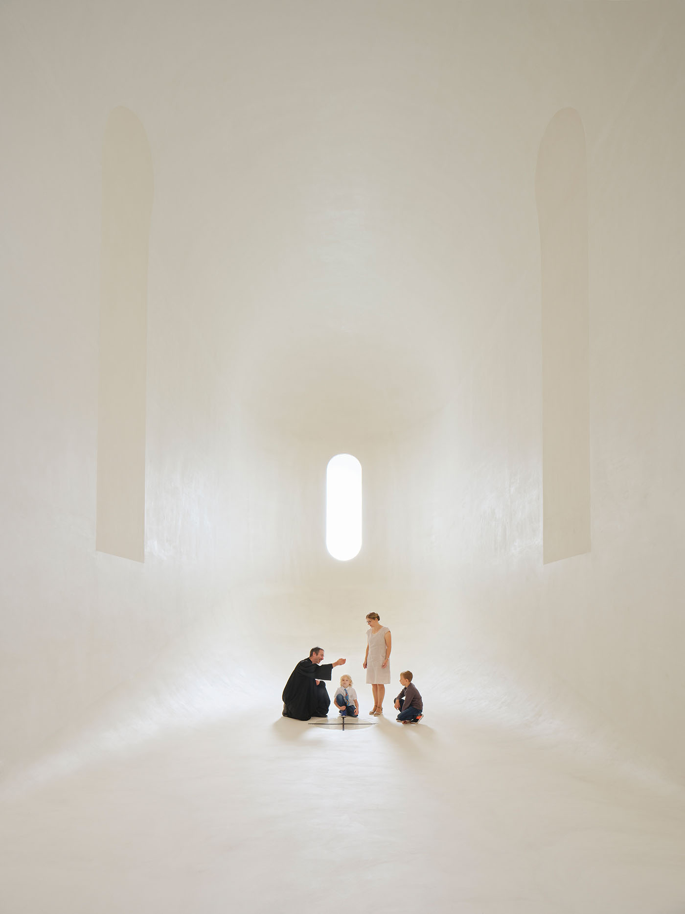 Dass dabei kein eigenschaftsloser White Cube entstehen muss, zeigt sich anhand des gestalterischen Konzepts: Mit vielschichtigen Sinneseindrücken, die durch fließende Raumkanten, kontemplative Lichtszenarien und skulpturale Raumelemente erzeugt werden, entsteht ein Kirchenraum, der trotz seiner Gegenwärtigkeit zur Transzendenz einlädt.