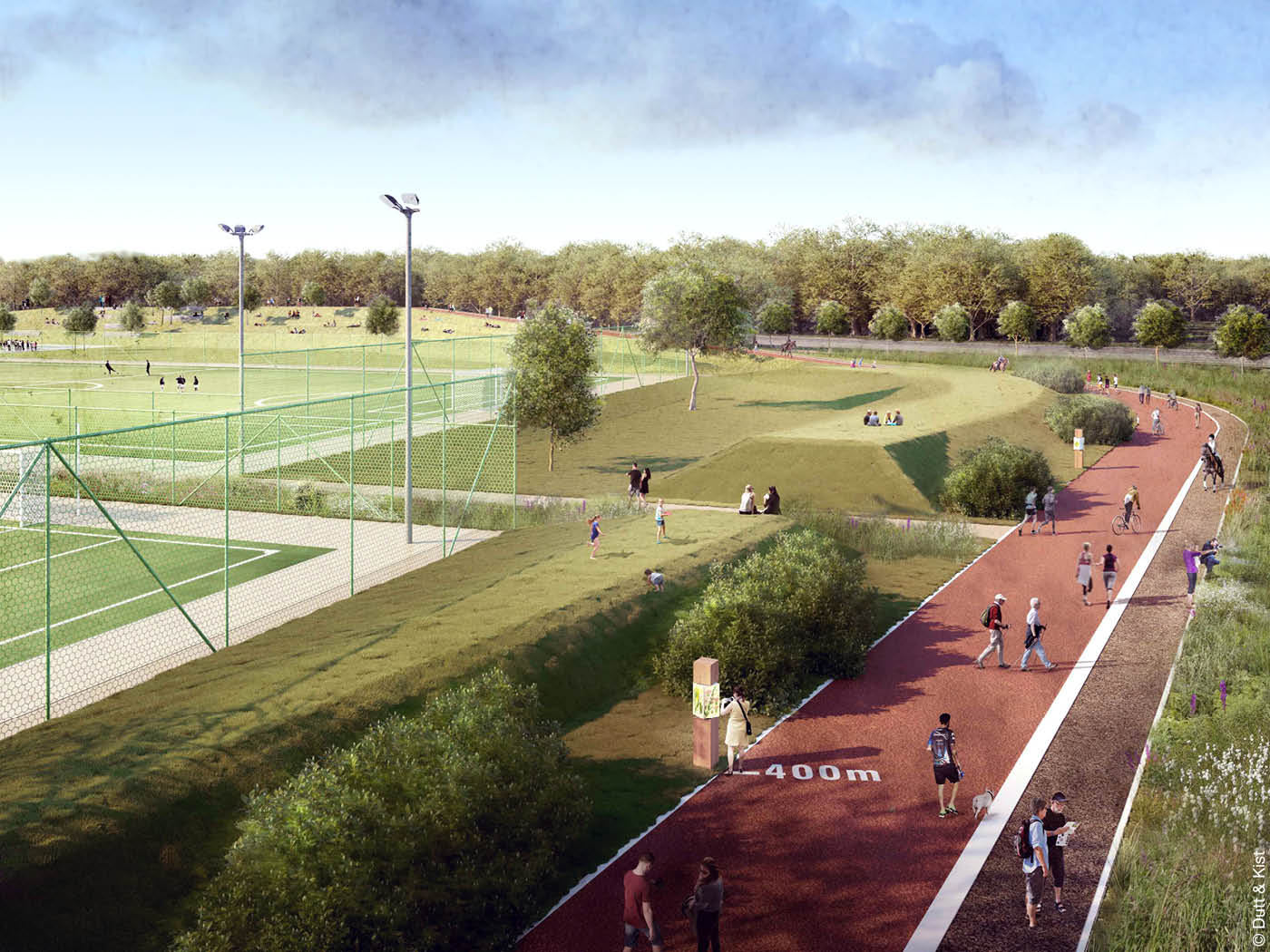 Um den Umgang mit Flusshochwasser wiederum geht es bei einem Areal in Karlsruhe-Durlach. Dieses soll zukünftig als Sportfläche dienen – gleichzeitig wächst der Bedarf an Wasserrückhalteflächen in Rheinnähe. Um die gegensätzlichen Ansprüche zur Flächennutzung zu vereinen, entwickelte bauchplan ).( in einer Konzeptstudie eine klimaangepasste, synergetische Lösung als Basis für einen nachgeschalteten Planungswettbewerb, den das Büro für Landschaftsplanung HDK Dutt & Kist gewann. Der Entwurf sieht eine Verlagerung der Sportflächen auf Hügel vor. Dazwischen liegen mit Gräsern und Wildblumen bepflanzte Senken, in denen sich das Wasser aus Starkregen und übertretenden Wasserläufen stauen kann, ohne die Sportflächen zu gefährden.