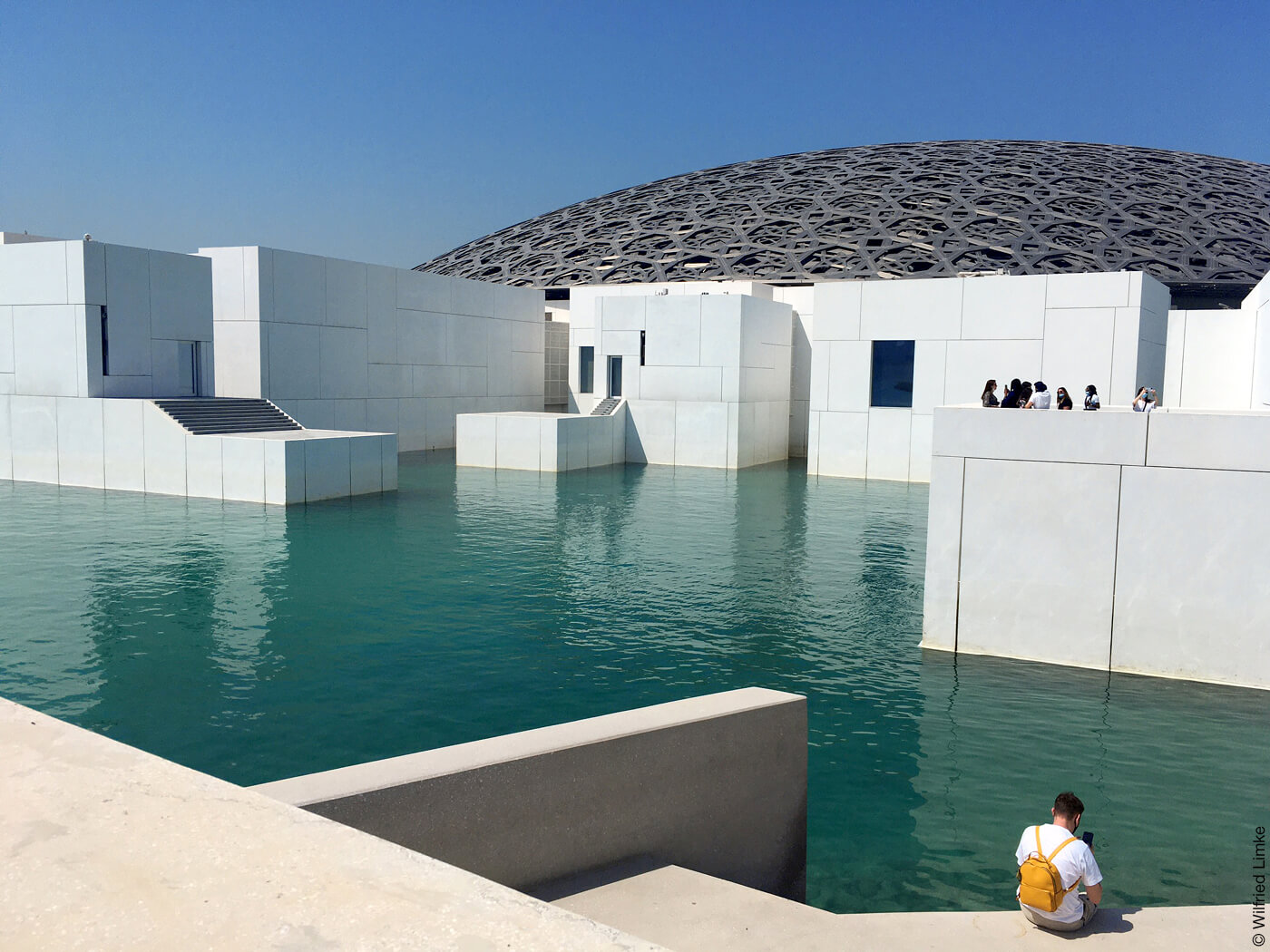 Beseelt von dem Expo-Besuch in Dubai, stand tags drauf ein Ausflug nach Abu Dhabi auf dem Programm. Seitdem gilt für mich als DAS architektonische Highlight mindestens für dieses Jahr: der „Louvre“ in Abu Dhabi des Architekten Jean Nouvel. Die Architektur erhebt sich aus dem Wasser des Persischen Golfs, überdeckt mit einer diaphanen Metallschale mit dem Gewicht des Eiffelturms. Innen ist außen und außen ist innen! Der „Lichtregen“ aus der Dachkonstruktion spielt mit der Umgebung und dem Betrachter.