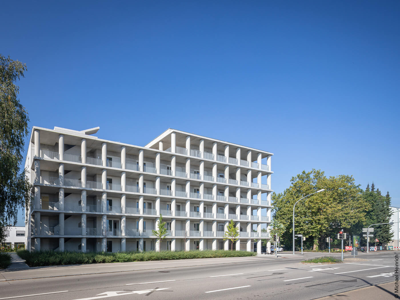 Man könnte es fast für das Fragment einer monumentalen Prachtstraße halten, was da an der wichtigsten südlichen Einfallstraße Neu-Ulms entstanden ist: ein schroffer Betonriegel, von sichtlich überdimensionierten Säulen rhythmisiert. „Ein Gestell“ nennt es sein Schöpfer Dietrich Fink vom Münchner Büro Fink+Jocher, das dem Wohnungsbau der letzten Jahrzehnte schon wichtige Impulse gegeben hat. Nun also ein „hartes, ungeschöntes Regal“ (Fink), das dem brausenden Verkehr trotzt.