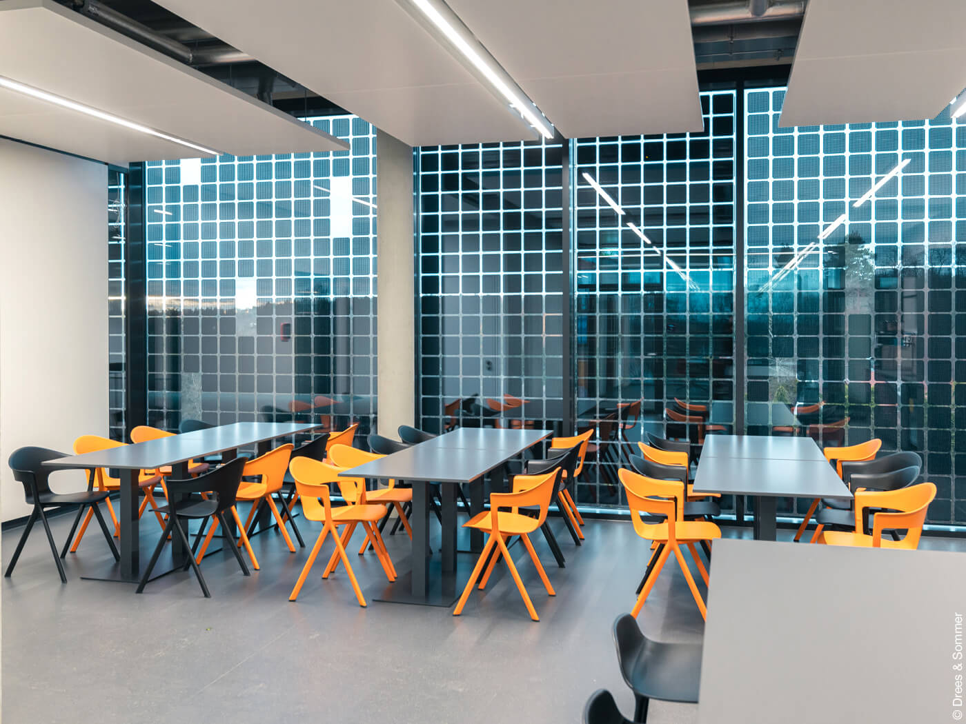 Insbesondere die Integration der Photovoltaik in die Fassade entlang der Autobahn sei sehr gut gelungen, findet die Architektin. Strukturell unterscheidet die vor ein Ortbetonskelett gehängte serielle Fassade zwar wenig von gängiger Meterware (der schwäbische Hersteller bestückt Investorenprojekte weltweit), doch die Innovation steckt hier im Detail.