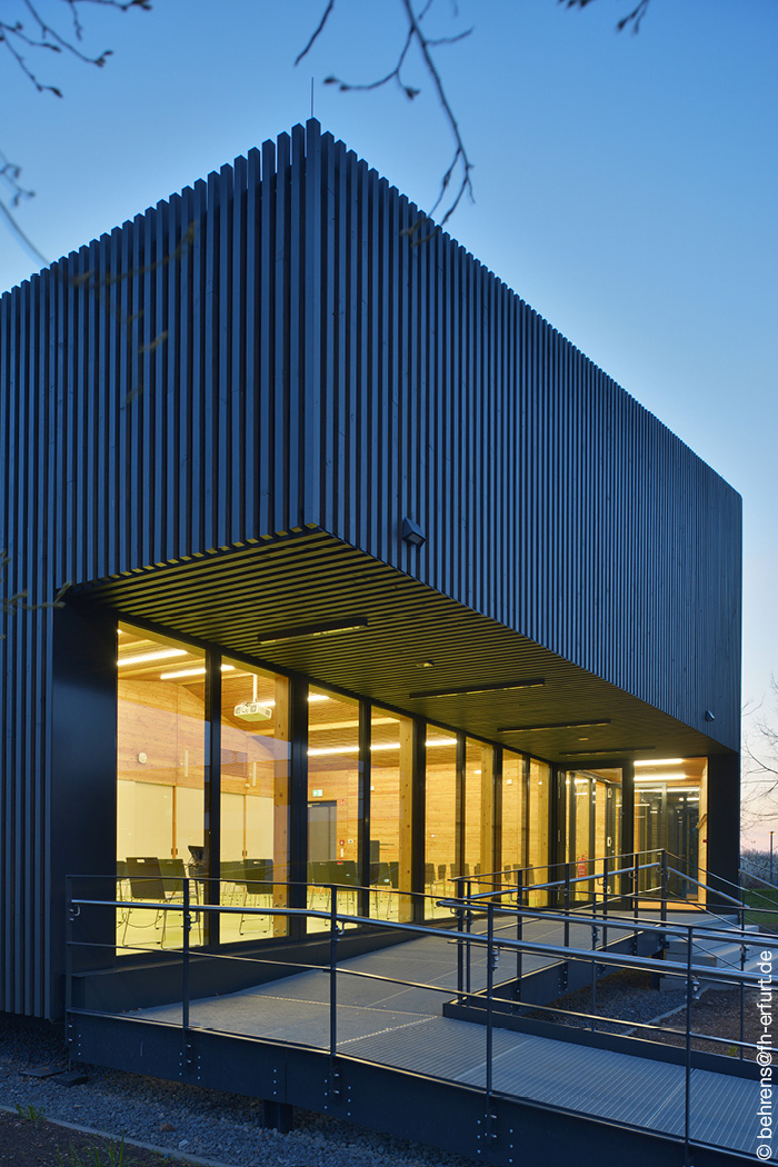 Beschäftigte des Thüringer Landesamts für Bau und Verkehr leiteten das Projekt. Für die Übergabe wurde ein ausführlicher Präsentationstermin angesetzt, bei dem die Studierenden dem Team von Funken Architekten sehr detailliert ihre Vorstellungen weitergaben. Mock-ups der Fassadenstudien inklusive Details zu Rauigkeit, Farbe und Breite der Holzlamellen wurden überreicht, ebenso eine konkrete Auswahl für die Möbel, ein Haustechnikkonzept, das komplett in die Gebäudehülle integriert war, und nicht zuletzt ein detaillierter Plan für einen begrünten Eingangsbereich inklusive des dazugehörenden Bewässerungssystems. Sich auf ein solches Projekt einzulassen und die eigene Kreativität hintenanzustellen, war für das Team des Architekturbüros Neuland.