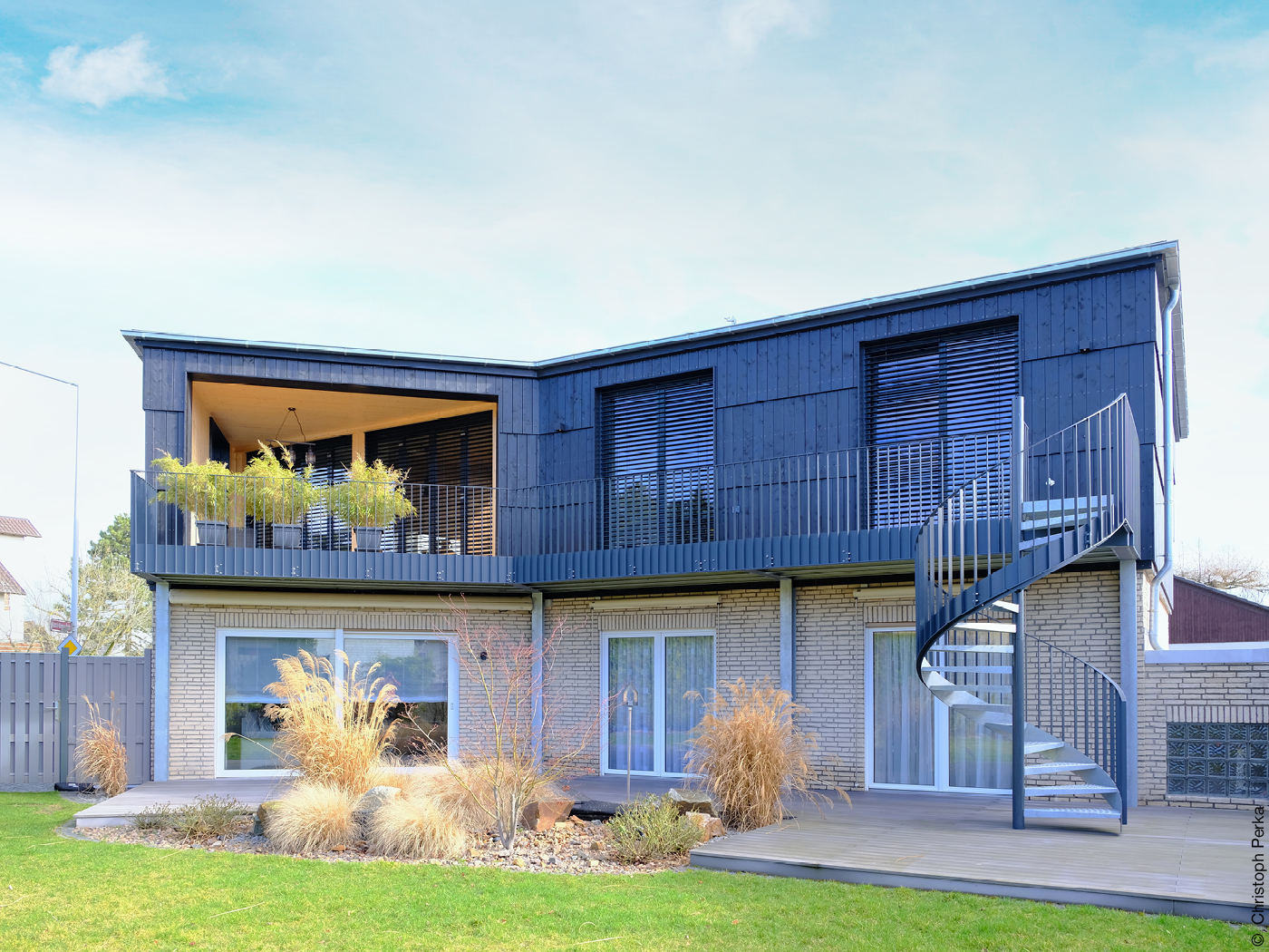 Die neu entstandene, knapp 140 Quadratmeter große Wohneinheit kostete netto 2.215 Euro pro Quadratmeter. Sie hat einen rechteckigen Grundriss. Ein Gebäudeknick des Bestandsbaus schafft oben zusätzlich Raum für eine dreieckige Loggia. Sie geht in einen Balkon über, der mit einer zweiten Wendeltreppe den schnellen Zugang zum Garten eröffnet. „Beim Übergang des Balkonbelages zu den Fassaden hatten wir den gestalterischen Anspruch, durch den Verlauf der Fugen eine Verbindung zwischen den beiden Bauteilen zu schaffen“, erzählt Christoph Perka. Frontal betrachtet, gehen Loggia und Balkon mit ihren schwarzen Bodenplattenkanten und dem schlichten schwarzen Metallgeländer optisch in die Fassade des Obergeschosses über.