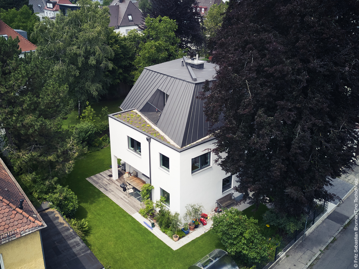 Nicht immer reicht jedoch die Grundfläche eines Einfamilienhauses aus, um alle notwendigen Räume für die Bauherren auf einer Etage anzuordnen. Dann kann eine Aufstockung in Kombination mit einem Anbau eine Lösung sein. Ein solches Vorhaben hat Architekt Tino Tschichholz in München für seine Schwiegereltern und seine junge Familie umgesetzt. „Die bisherigen alleinigen Bewohner des Gebäudes wollten mit dem Umbau drei Ziele realisieren: Sie wollten die Nutzfläche ihrer Wohneinheit verkleinern, alle Räume barrierefrei und außerdem die Raumanordnung effizienter gestalten“, fasst der junge Architekt seinen Auftrag zusammen.