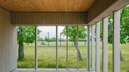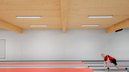 Ähnlich folgerichtig ist die Konstruktion: Mächtige BSH-Träger (240 x 480 Millimeter) überbrücken stützenfrei die gesamte Grundfläche in Querrichtung, darauf liegend eine an der Innenseite unverkleidete Brettsperrholzdecke (100 Millimeter), in die, wo erforderlich, runde Oberlichter eingeschnitten sind. Die Außenwand besteht aus einer Holzständerkonstruktion, die wetterseitig vertikal mit unterschiedlich breiten sägerauen Lärchenholzbrettern verschalt und mit lisenenartig aufgesetzten Kanthölzern rhythmisiert wurde. Entwurfsdetails, deren Ausführung kaum Mehraufwand erzeugt, die jedoch den wesentlichen Unterschied markieren zwischen Architektur und einer Sportlerbaracke.