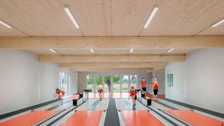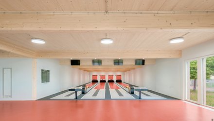 Auch das Timing stimmte. Heute sind Holz und Handwerksbetriebe rar, und für die damals schon knapp bemessenen 1,2 Millionen Euro ließe sich das Gebäude zurzeit wohl kaum in dieser Qualität errichten. Doch die Sparsamkeit war bereits in der Struktur angelegt. Den Kern des Grundrisses bildet das vom Reglement des Deutschen Keglerbunds definierte Rechteck der vier Kegelbahnen. Die lange Seite wird von einer Spange aus Umkleiden, Duschen, Schiedsrichterraum, Büro und Abstellflächen flankiert; der kurzen Seite ist eine Zone der Vereinsgeselligkeit vorgeschaltet.