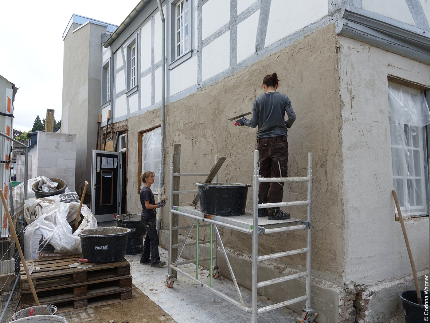 Die Gefache der Außenwände wurden im Frühsommer freigelegt und neu hergerichtet. Beim Lehmputz halfen auch Mitarbeiterinnen des Architekturbüros von Corinna Wagner samt Familie im Rahmen einer „Projektwoche“ in den Schulferien. Wagners schon mehrfach preisgekröntes Büro hat stets den Bezug zur Praxis sehr wichtig genommen und regelmäßig „Praxistage“ für ihr Team veranstaltet, bei denen der Kontakt zu den Techniken und Materialien hautnah gepflegt wird.