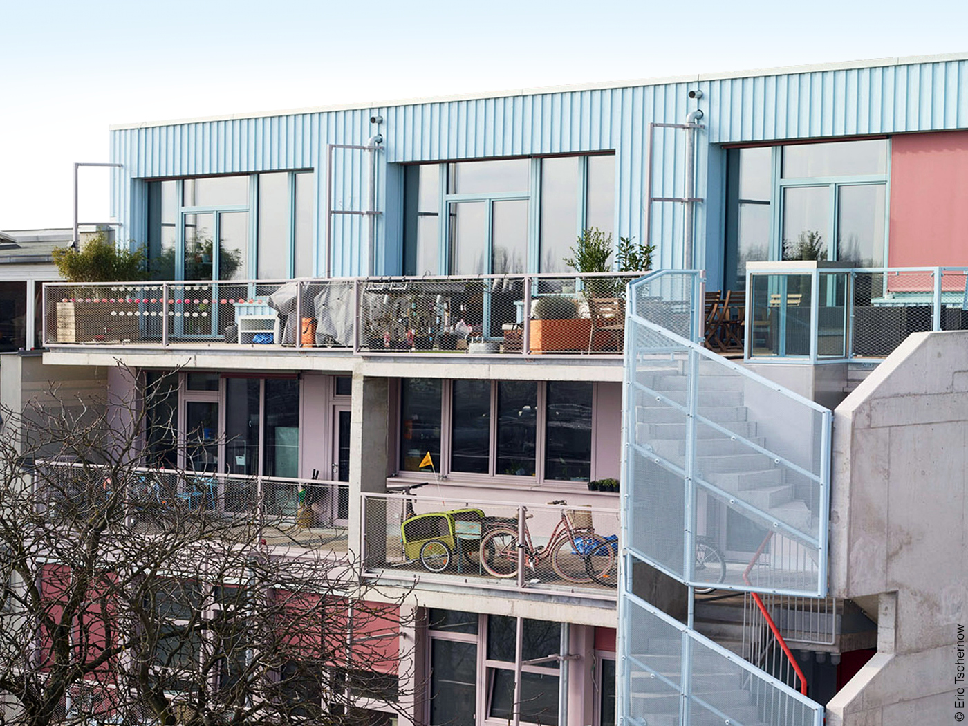„Der Vorteil dieses Konzepts ist, dass niemand einen separaten Raum aufsuchen muss, um Mitbewohner zu treffen“, erklärt Wenke Schladitz. „Kontakt ist hier immer und auf eine sehr informelle Art möglich.“ Das gilt auch für das zweite prägende Element des Lovo, das halb offene Treppenhaus auf der Hofseite, und für die auch vom Treppenhaus zugänglichen Balkone. Sie sind bis heute nur durch Stahlprofile voneinander getrennt und haben so den Charakter von Laubengängen.