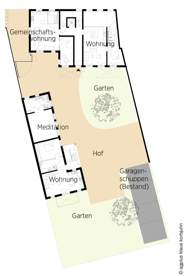„Die Mitglieder der Baugruppe hatten ein sehr unterschiedliches Budget zur Verfügung. Die Gebäude sind also das Ergebnis eines intensiven Abstimmungsprozesses, damit schließlich alle einziehen können“, sagt Architekt Korbjuhn. Im Vorderhaus steht eine 56-Quadratmeter-Gemeinschaftswohnung mit einem Schlafraum und einem großen Wohnraum samt offener Küche allen zur Verfügung und könnte perspektivisch auch für eine betreuende Person genutzt werden.