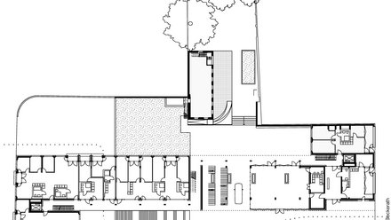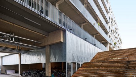 Insgesamt 58 Wohnungen finden sich nun im bis zu siebengeschossigen Neubau, der sich zwischen zwei verputzten Kopfbauten an einem breiten Laubengang entwickelt. Auf dem Weg gibt es mehrere Plätze, eine breite Freitreppe und einen großen „Spiegelsaal“, der sich auf breiter Front ins Freie öffnen lässt. Und natürlich liegt mittendrin die alte Schmiede, die heute den Bewohnern als Werkstatt dient. Daneben findet sogar noch ein Garten Platz!