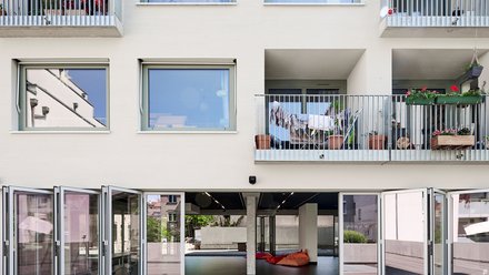 Auch organisatorisch ist das Ensemble ein Hybrid: Die geförderten Wohnungen und die Hausverwaltung liegen in der Zuständigkeit einer Genossenschaft, die auch ein Vorkaufsrecht auf frei werdende Räume der Baugemeinschaft hat. Rund die Hälfte ihrer Wohnungen vermietet die Genossenschaft an die Lebenshilfe und Flüchtlinge, eine vergibt das PEN-Zentrum an Exil-Schriftsteller. So entsteht eine sozial gemischte, bunte Nachbarschaft, die der weiteren Entwicklung des Viertels einen guten Weg weisen kann.