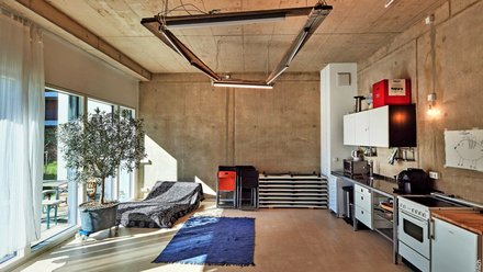 Wie in Leipzig bestehen die meisten Wände des Hybrids aus Holztafeln, die hinter Putz verschwinden. Die industriellen Betonfertigteile der Tragstruktur sind im Inneren in weiten Teilen sichtbar und geben dem Haus den Charakter eines ruppigen Experimentierfeldes. Die Bewohnerschaft vermag damit gut umzugehen, ihre Zutaten bilden vielerorts eine zweite Schicht.