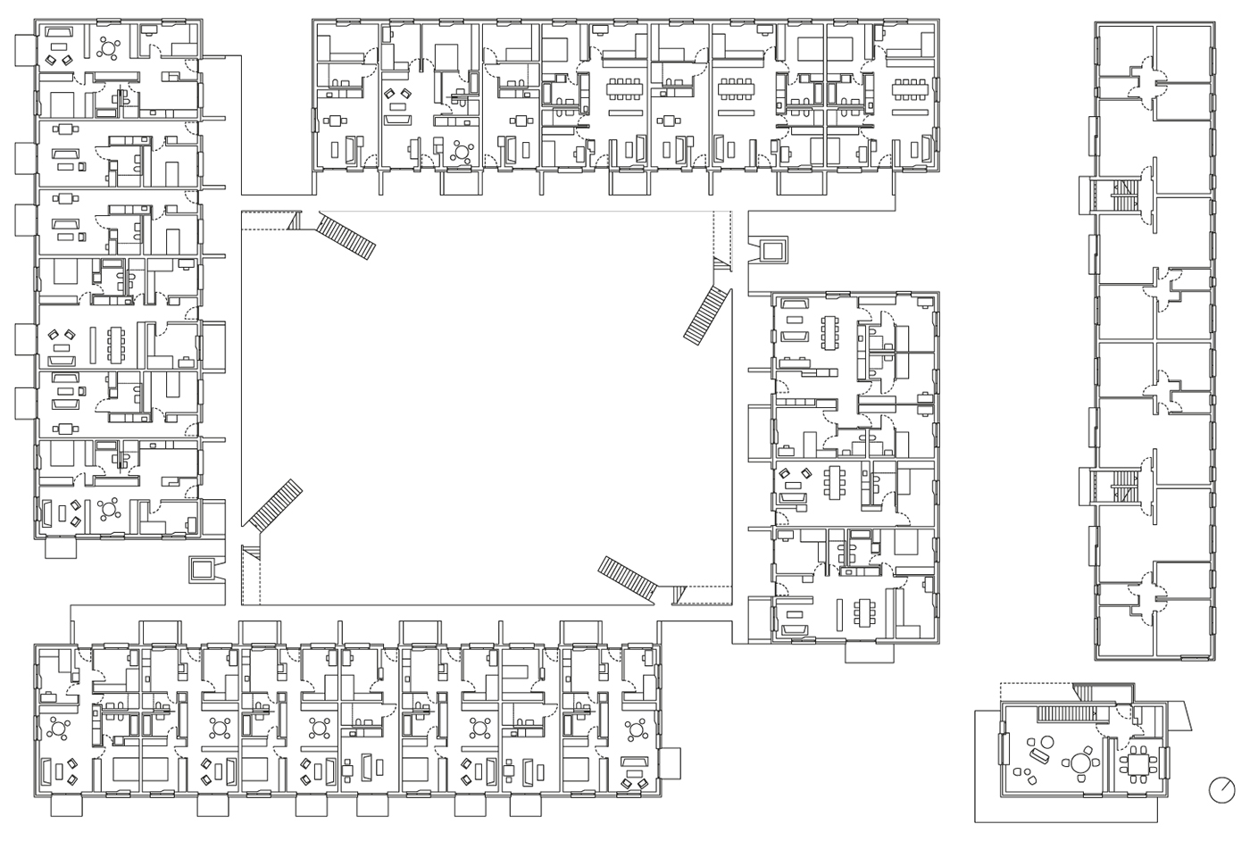An der Blockecke zum „Loop“, dem Rundweg des Stadtteils zum Joggen oder Radeln, fand das Gemeinschaftshaus Platz, in dem es einen Saal mit Küche sowie eine Dachterrasse unter altem Baumbestand gibt. Im Keller kann eine Fahrradwerkstatt genutzt werden. Eine Quartiers-App vernetzt die Bewohnerschaft.