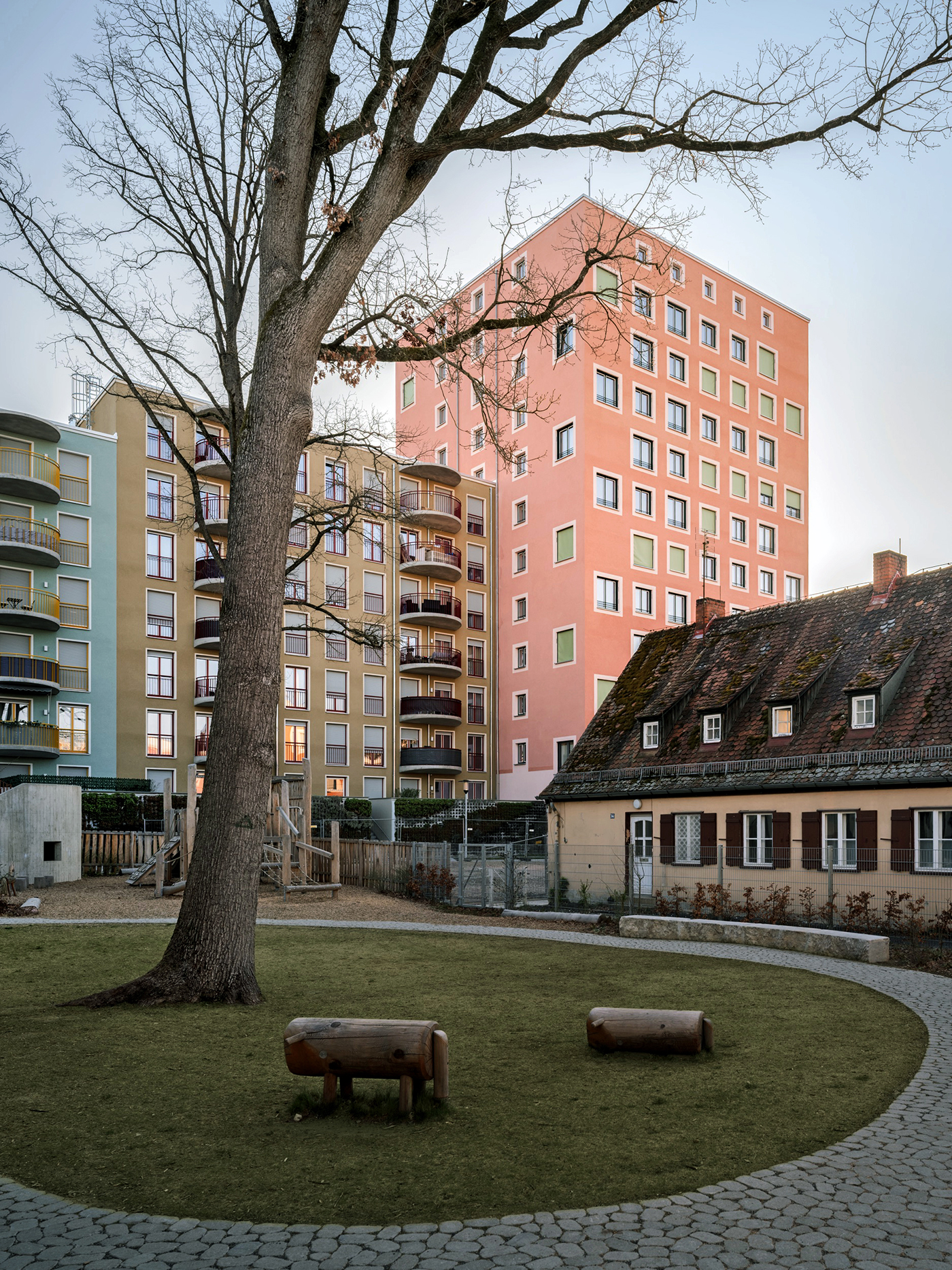Das von lärmender Infrastruktur umzingelte Regensburger Viertel am Stadtrand von Nürnberg ist dicht, aber differenziert. Jedes Gebäude bildet eine erkennbare Adresse.