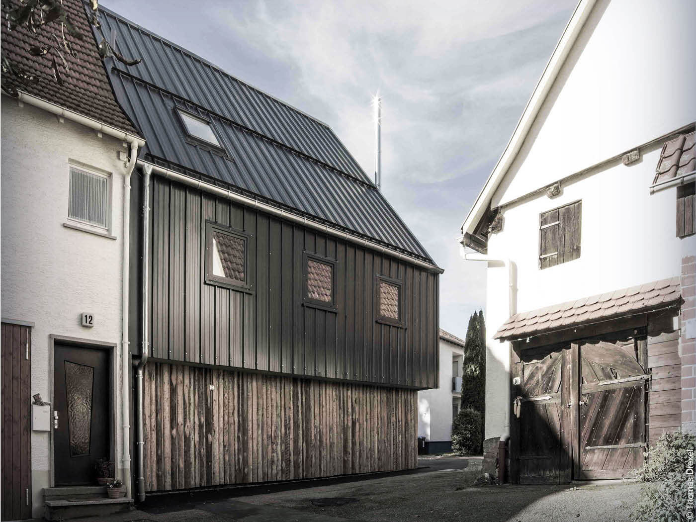 Doch der Reihe nach: Die junge Familie mit zwei kleinen Kindern kaufte eine baufällige alte Scheune mit 99 Quadratmetern Garten im Ortskern von Leutenbach. Auf der Ostseite war sie an den Wohnteil einer alten Hofstelle angebaut, der als etwas schmuddeliger Putzbau überdauert hat. Die Scheune jedoch riss man ab. Ihr Ersatzbau wagt radikal Neues, ohne dabei allzu weit vom ländlichen Nutzbau entfernt zu sein, den die Scheune zuvor ja darstellte.