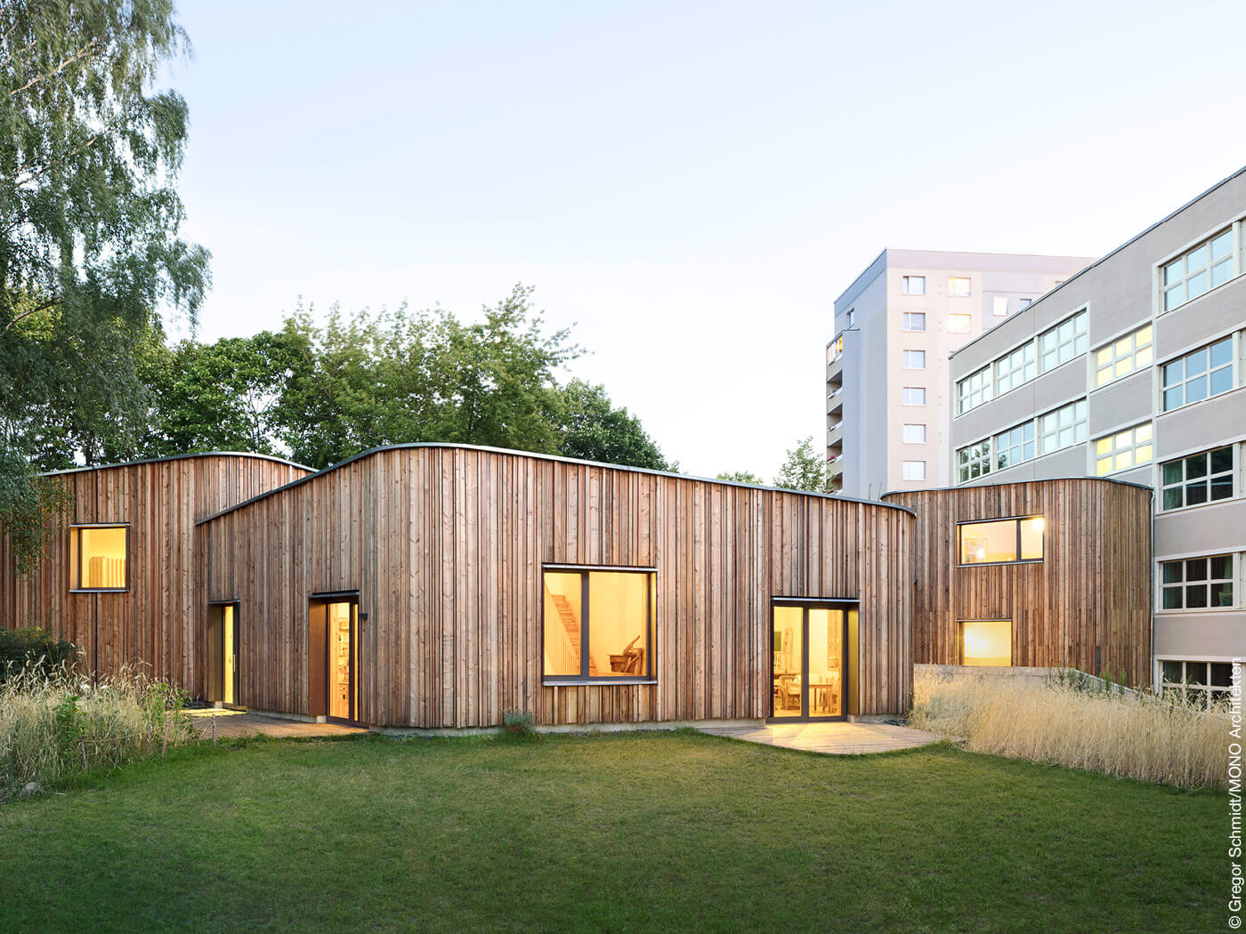 Der im Sommer 2017 eingeweihte Hort ist auf unorthodoxe Weise den Ideen der Waldorfpädagogik verpflichtet und ein Musterbeispiel, wie nachhaltig geplant und ökologisch gebaut werden kann. Durch den wabenartig aufgebauten Grundriss, die leicht gekippten Traufkanten und die Fassade aus unbehandelten Lärchenholzbrettern unterschiedlicher Breite und Tiefe gelang MONO Architekten ein organisch bewegter Baukörper, der den kindlichen Erfahrungshorizont anspricht. Das kleinteilige Wechselspiel von Innenräumen und klar zugeordneten Außenbereichen überzeugt auch deshalb, da die gleichberechtigte Zusammenarbeit mit allen an der Planung Beteiligten – in diesem Fall das Berliner Büro gm013 Landschaftsarchitektur, das sich ebenfalls 2013 gründete – für MONO erklärtes Ziel ist.