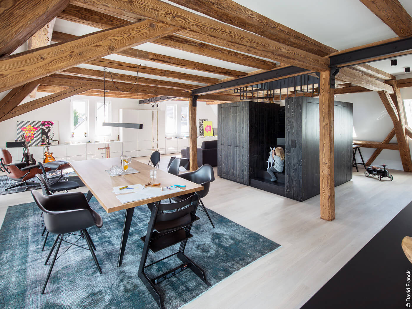 Die oberen drei Geschosse dienen als insgesamt 155 Quadratmeter große, grundrissoffene Wohnung. Ein zentrales Treppenmöbel, platziert dort, wo sich früher der Seilzug über alle Geschosse befand, birgt jetzt die wohnungsinterne Treppe, zusätzlich Schränke, die Hausbar und einen Abstellraum. Großzügige Fenster im Dach sorgen für viel Licht im Wohnraum. Hier ist Architekt Zlatko Antolovic mit seiner Familie eingezogen.