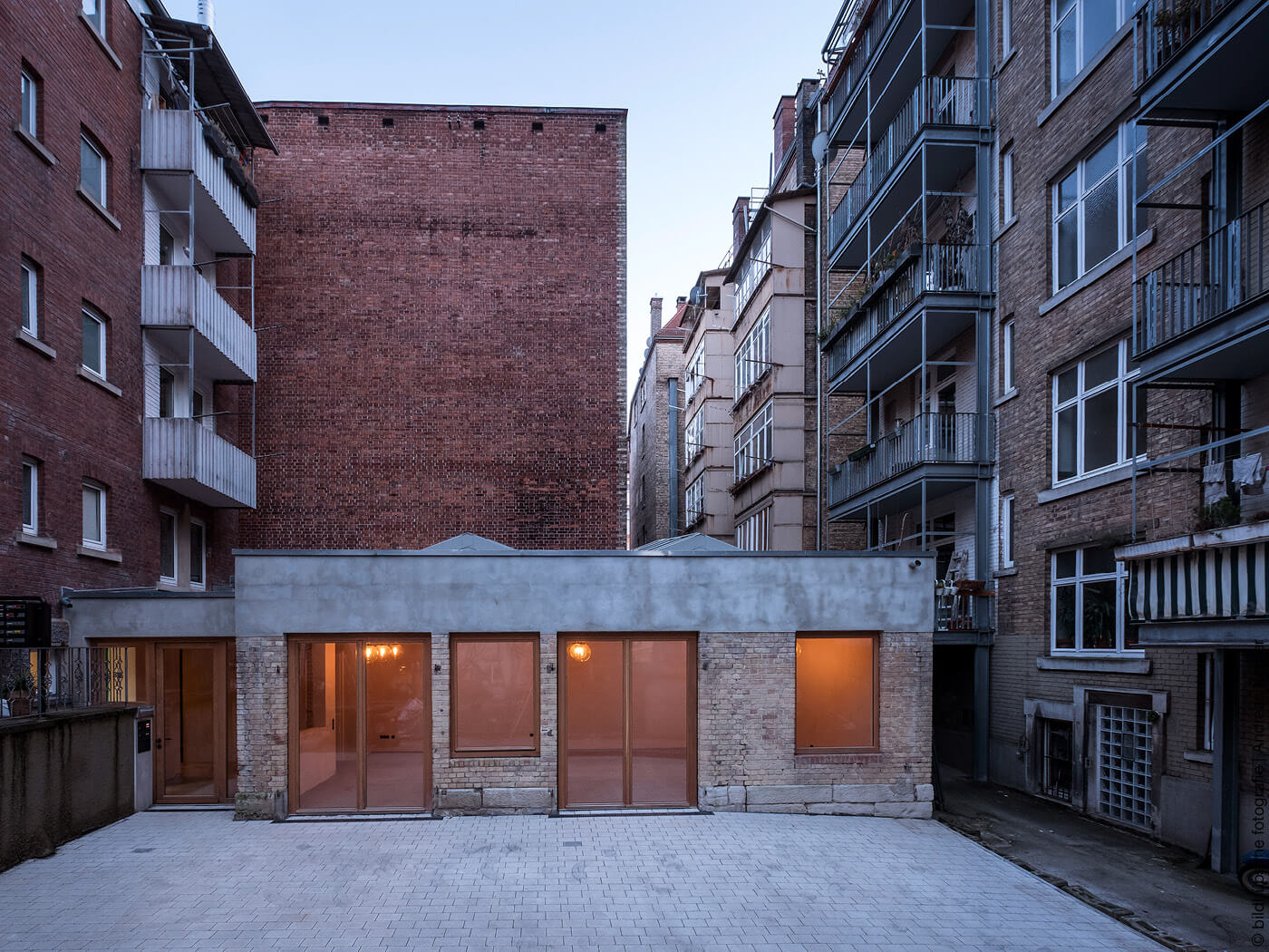 Ein paar Kilometer weiter westlich, in einem Stuttgarter Innenhof, war die Ausgangslage eine ganz ähnliche. Hier fand die Architektin Tina Kammer ein für den Stadtteil typisches einstöckiges Hinterhof-Gebäude aus dem Jahr 1904 vor, an dessen Rettung zu glauben viel Fantasie erforderte: Der einst von einem kleinen handwerklichen Betrieb genutzte „Schlosserhof“ war fast komplett verfallen, das Dach eingestürzt, entsprechende Feuchtigkeit befand sich in den Gebäuderesten.