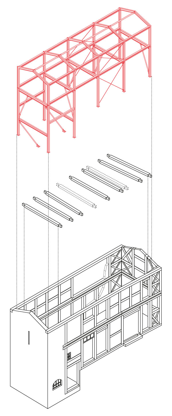 Eine neue Stahlstruktur steift den baufälligen Hühnerstall mit dem Satellitenbüro von Atelier Fanelsa aus.