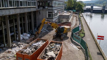 Dazu zählen drei Photovoltaik-Anlagen mit 450 kWp Leistung, davon eine mit 75 kWp in der künftigen Fassade, einem Speicher mit 60 kWp sowie eine Wasser-basierte Wärmepumpe mit 250 Kubikmetern Durchsatz des Flusswassers pro Stunde, die die saisonale Temperaturdifferenz nutzt.