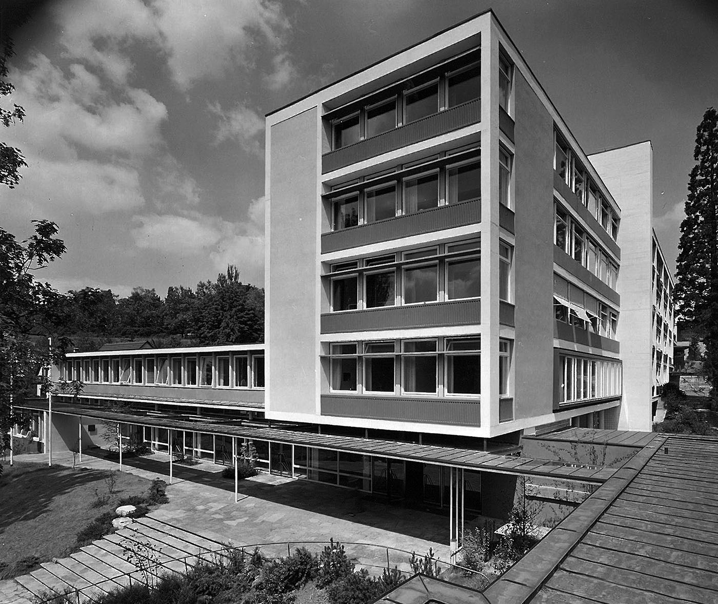 Im selben Jahr wie das AOK-Gebäude in Kassel vollendete 1957 Hans Bregler in Stuttgart den Neubau des altehrwürdigen Eberhard-Ludwigs-Gymnasiums, kurz und liebevoll Ebelu genannt. Das alte Schulhaus, ein sehr schöner, sehr repräsentativer historistischer Bau von 1903, war im Krieg zerstört worden.