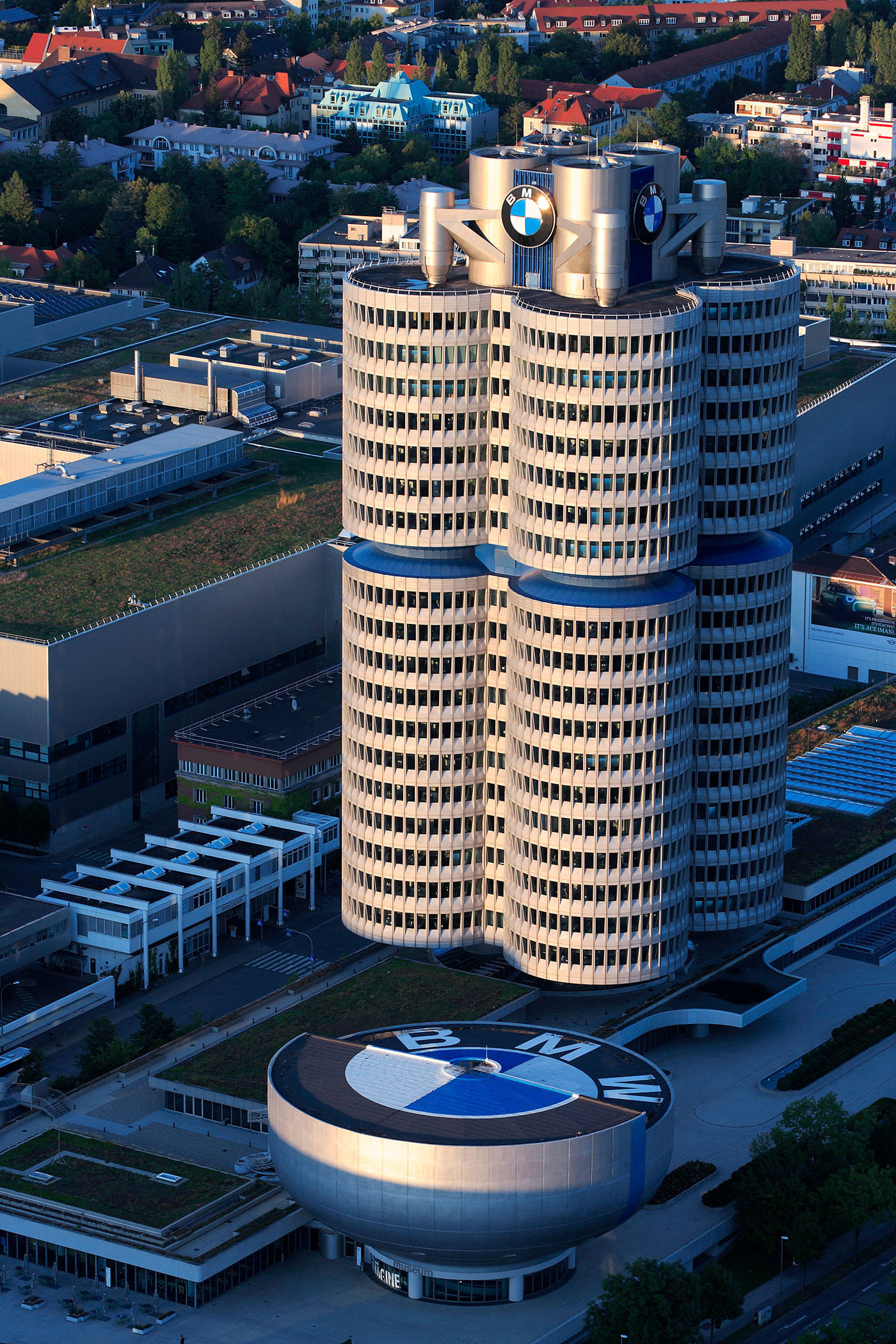 Visionär ist auch heute noch das Verwaltungsgebäude des Fahrzeugherstellers BMW, das 1968–1973 als Hochhaus in der Grundform von einem Vierzylinder errichtet wurde. Der Architekt Karl Schwanzer entwarf das zweckmäßige Gebäude. Es ist 99,50 Meter hoch und besitzt einen Durchmesser von 52,30 Metern, wobei 18 Geschosse in ein Betonskelett eingehängt wurden. Gebaut wurde von oben nach unten. Der Vierzylinder ist Symbol und funktional. Durch den mittigen Erschließungs- und Sanitärkern sind die Wege kurz und die Grundrisse lassen sich bei guter Belichtung variabel nutzen.