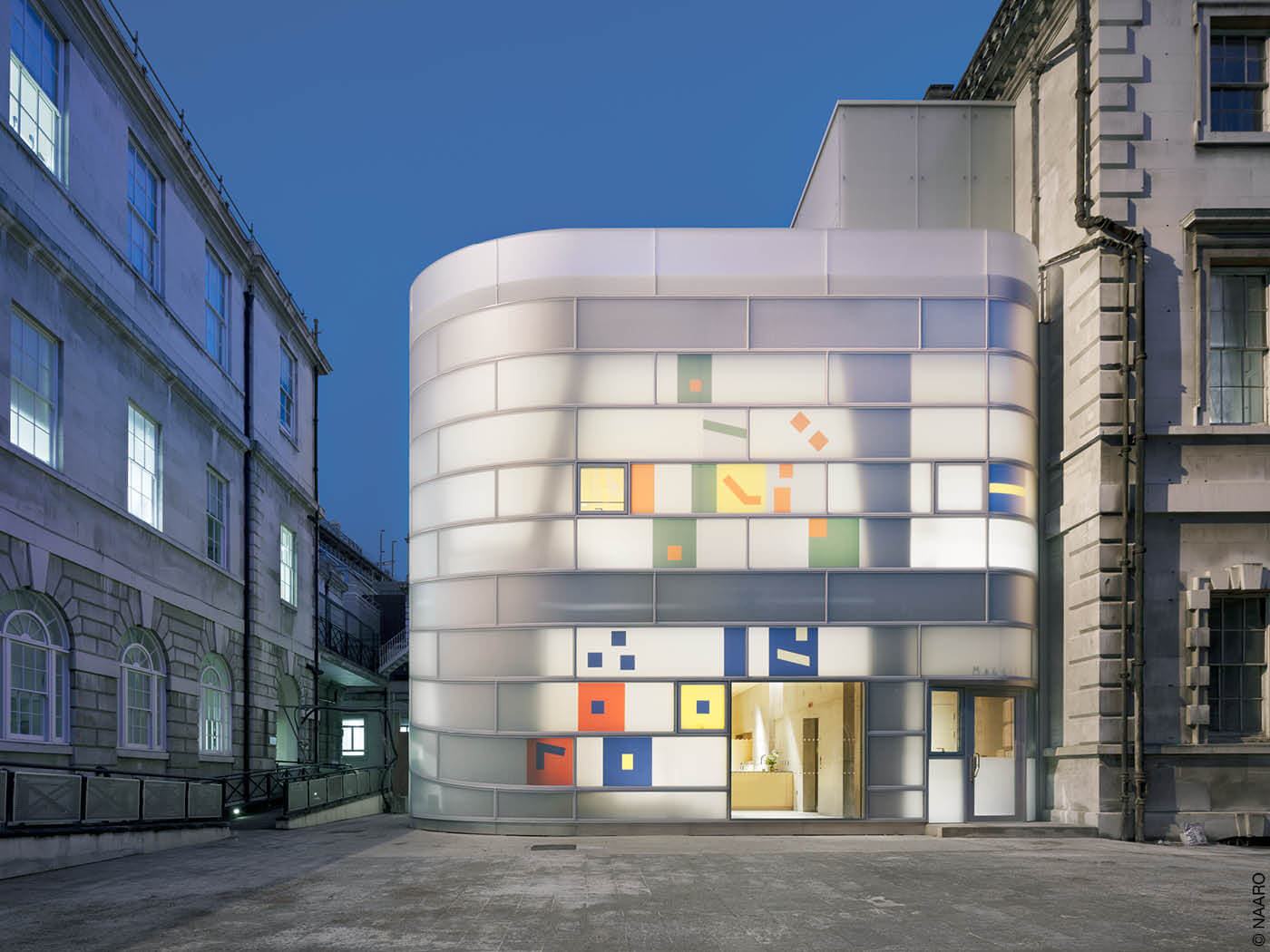 Das Maggie’s Barts liegt seit 2017 im Zentrum Londons unweit des Barbican Centres auf dem Gelände des St. Bartholomew’s Hospital, Londons ältester Klinik. Tagsüber wirkt der kleine Baukörper von Steven Holl eher kompakt, wobei die Aufteilung der matten Glasfassade die Gliederung der benachbarten Rustika-Sockel aufgreift. Geht im Haus das Licht an, ist der Kontrast zu den mächtigen Altbauten umso größer: nun gewinnt das Maggie’s Centre an Leichtigkeit und es schimmert wie ein Juwel mit farbigen Akzenten.
