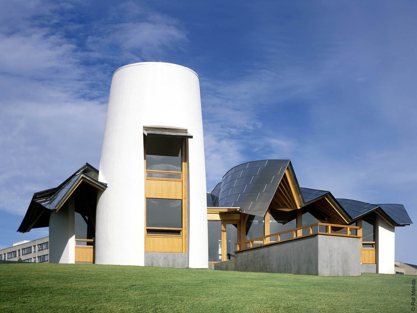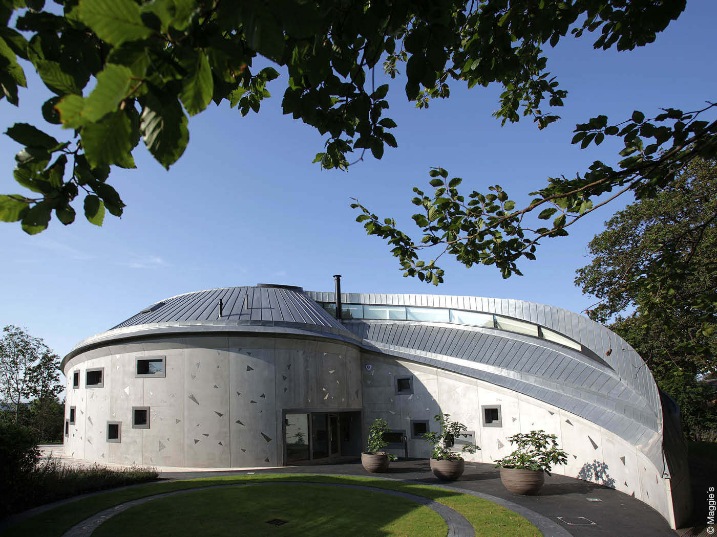 Das hüttenähnliche Gebäude mit einem gewellten Silberdach ist einer traditionellen schottischen „butt n‘ ben“-Wohnung nachempfunden und bietet ein einladendes Gefühl von Ruhe und Geborgenheit. Maggie’s Dundee war 2003 der erste Neubau für ein Zentrum der Stiftung und wurde von Frank Gehry entworfen.