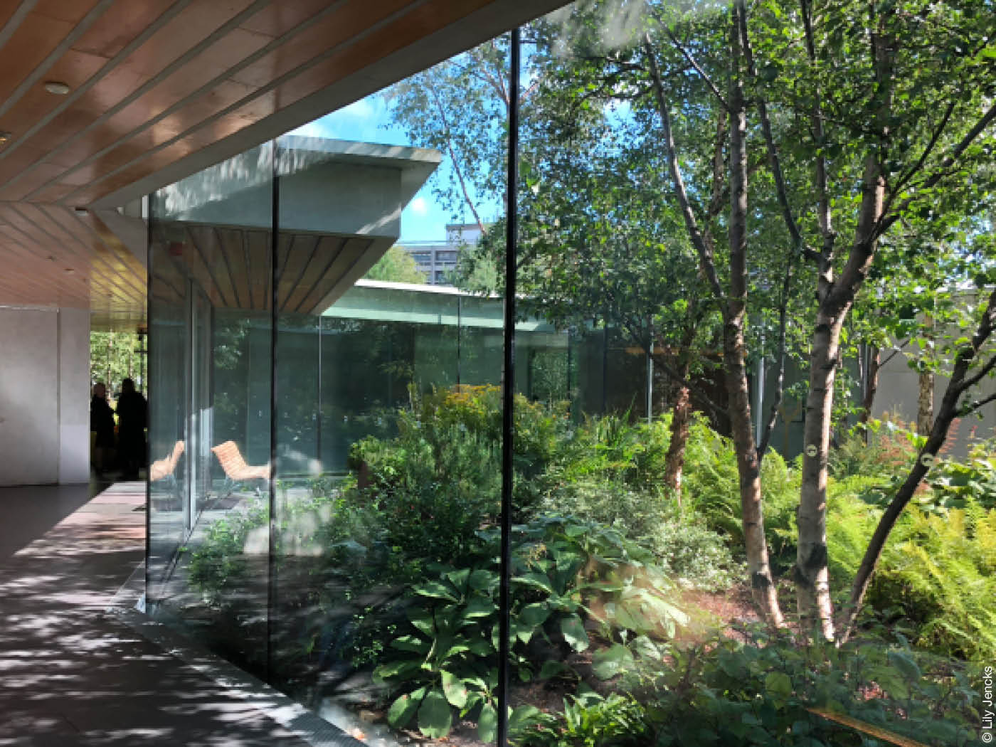 Die Gärten wurden von dem Landschaftsdesigner Dan Pearson entworfen. Ihre Farben und die sinnliche Erfahrung der Natur werden durch Mikrogärten und Innenhöfe, die sich auf die verschiedenen Räume innerhalb des Gebäudes beziehen, zu einem Teil des Zentrums. Tiefe Vordächer schützen die offenen Terrassen vor Regen schützen, sodass man bei jedem Wetter den Garten genießen kann.