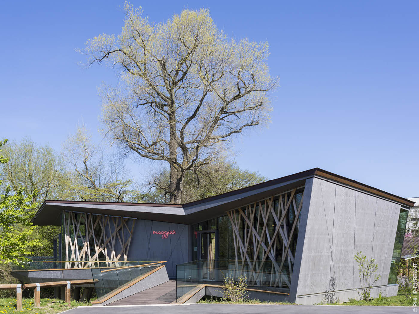 Das Baumhaus auf Stelzen assimiliert sich im umliegenden Wald. Der Entwurf schafft diskrete Räume für Entspannung, Information und Therapie. Touchstone Collaborations (ehemals Topio) waren für die Landschaftsplanung verantwortlich. Sie haben sich mit lokalen Initiativen zusammengetan und die bedrohten Grünflächen am nahen Bach gesichert. Die Pflanzung von Bäumen und Sträuchern und die Aussaat von Wildblumen soll die bestehenden Pflanzengemeinschaften stärken und einen sich entwickelnden Lebensraum für die lokale Tierwelt bieten. Maggie’s Oxford wurde 2014 eröffnet.