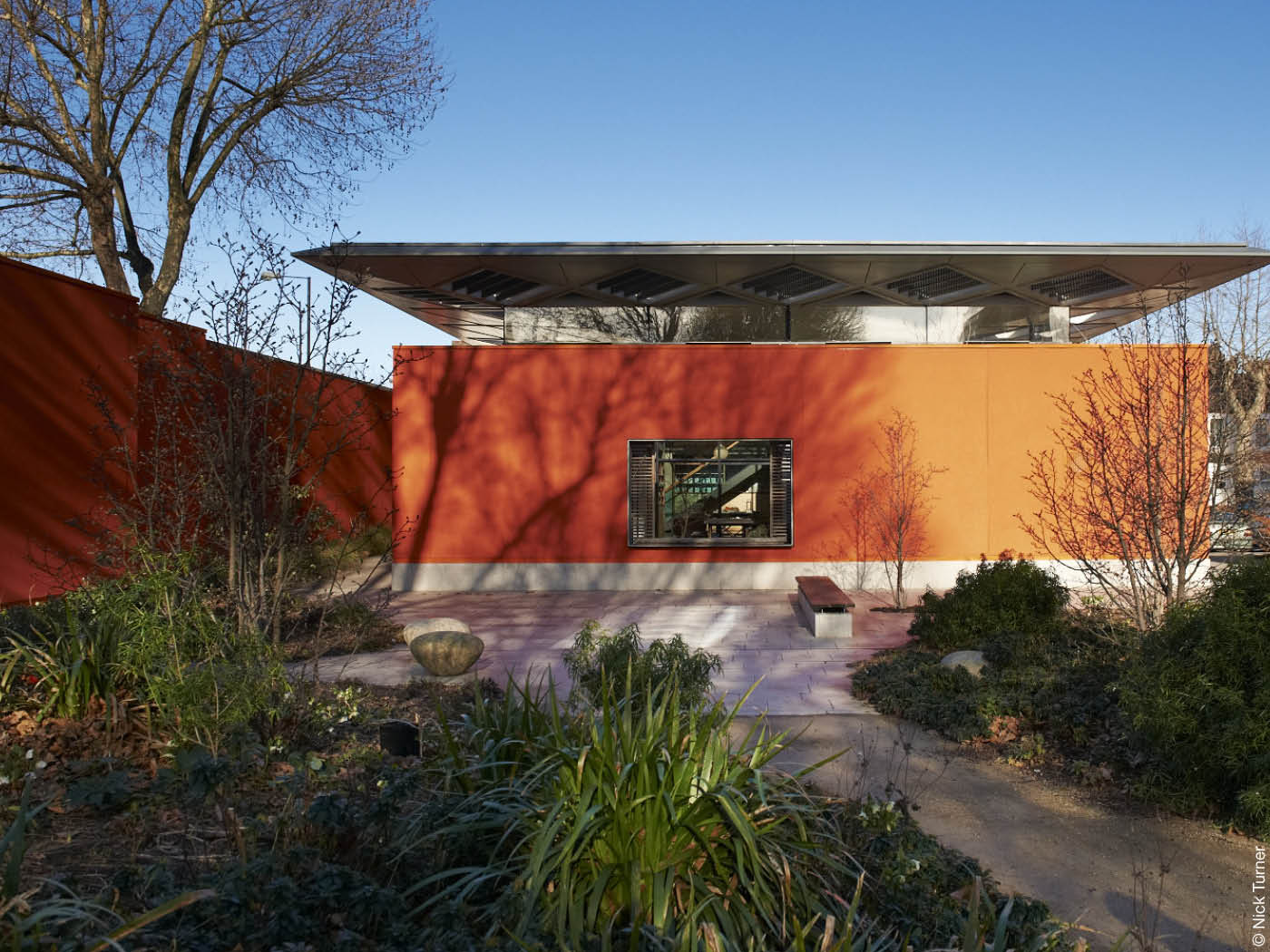 Das 2008 erbaute Gebäude schirmt seine Besucher schützend von den belebten Straßen der Stadt und dem angrenzenden Krankenhaus ab. „Das Dach, die Landschaftsgestaltung, die Feuerstelle im Inneren, die Aussicht nach draußen – all das soll die Nutzer vom Krankenhaus und dem Trubel auf der Straße wegbringen“, so Richard Rogers. Die leuchtend orangefarbenen Wände führen die Besucher in helle und offene Räume. Das Haus befindet sich in einer Abfolge von Höfen und einem Garten, der die Menschen vom Krankenhaus aus zum Maggie’s West London führt.