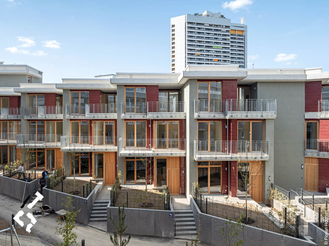 In den „Türmen“ wie in den Townhouses bieten Loggien geschützte Freiräume – bei der Enge des Gegenübers am Hof bestimmt vorteilhaft. Nicht nur gebäudetypologisch, sondern auch gestalterisch gibt es eine gewisse Vielfalt: Während die stark aufgelösten Fassaden der frei finanzierten Townhouses Anklänge an Louis Kahn zeigen, mit Sichtbetonteilen und Fenstern aus unbehandeltem Lärchenholz, sind die geförderten Bauteile schlicht verputzt und haben weiße Kunststofffenster. Fliesenfelder sorgen für ein gewisses „Make-up“, wie es Müsseler ausdrückt. Tatsächlich bekommen die Baukörper so ein „Gesicht“ und wirken keinesfalls billig. Farblich korrespondieren sie miteinander in Grün- und Ockertönen. Auch im Inneren gibt es kräftige Farben, durchgängig furnierte Türen und hochwertiges Parkett. Die Bruttobaukosten lagen trotzdem nur bei gut 2.000 Euro pro Quadratmeter, im frei finanzierten Teil nur wenig höher.