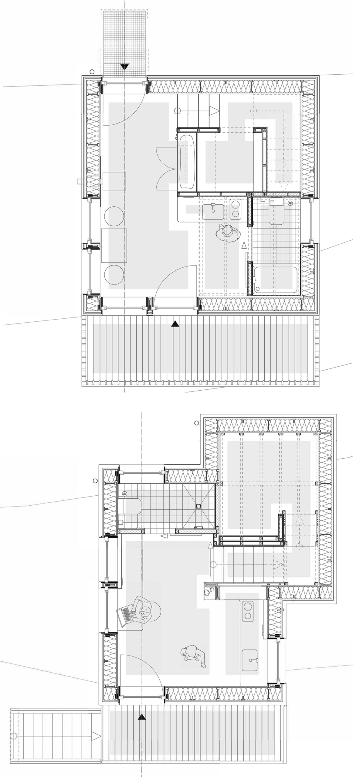 Minimiert: Während Modellhaus M1 (oben) einen offenen Grundriss aufweist, sind die Räume im Modellhaus M2 stärker ineinander verschachtelt.