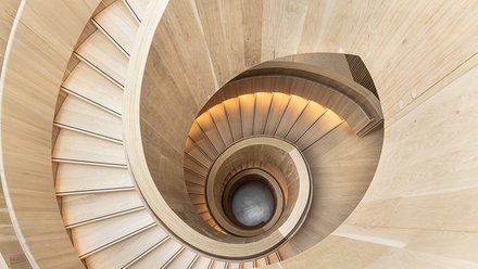 Im Inneren zieht im Atrium, am Schnittpunkt der drei Flügel, die Wendeltreppe aus Holz alle Aufmerksamkeit auf sich. Vom Untergeschoss bis hinauf zur Dachterrasse schraubt sich diese zwölf Tonnen schwere, aus massiver Eiche und Fichte bestehende Treppe, die wohl auch als Allusion an das sich windende Haar von Rapunzel zu verstehen ist.