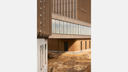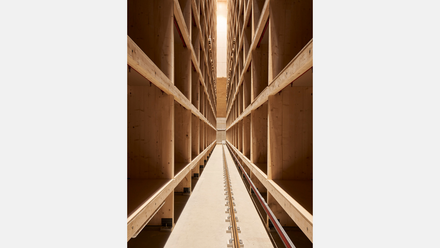 Am meisten Ökologie fürs Auge bietet jedoch das Hochlager, dessen unterer Fassadenbereich aus dem Lehm-Aushub vor Ort errichtet wurde. Bekanntlich vermag Lehm in natürlicher Weise Temperatur und Luftfeuchtigkeit auszugleichen, ermöglicht dadurch den Verzicht auf lufttechnische Anlagen und spart in der Herstellung deutlich CO2 ein, da er nicht gebrannt wird. Ein Selbstläufer ist eine Lehmkonstruktion von acht Metern Höhe allerdings nicht.