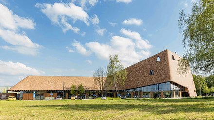 Architektonischer Hingucker des Neubaus ist eine schwungvoll bewegte, weit heruntergezogene und mit Ziegeln verkleidete Holz-Dachkonstruktion, die bewusst märchenhafte Assoziationen an ausladende Pilzhüte oder Hexenhäuschen evoziert und das sternförmige, mit drei Strahlen in die Umgebung ausgreifende Gebäude überspannt. An einer Ecke senkt sich das Dach bis zum Boden herab und steigt zugleich turmförmig bis auf eine Höhe von 21 Metern.