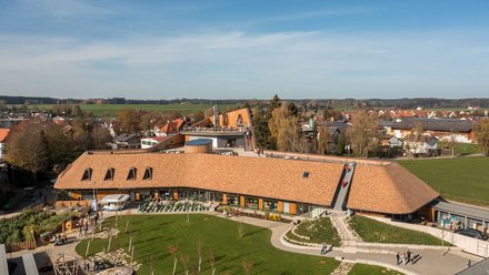 Die vom Landschaftsarchitekturbüro Ramboll Studio Dreiseitl aus Überlingen gestalteten Außenanlagen sind vielfältig, verweisen in manchen Details jedoch vor allem auf die Allgäuer Landschaft: Da gibt es einen Bauerngarten mit Holzstapeln, einen „Märchengarten“, einen Abenteuerspielplatz, schließlich aber auch ein exotisches Tropenhaus für den Anbau von Mangos und Kaffeepflanzen.